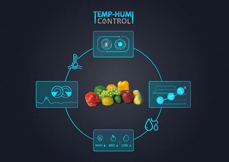 Компрессор и вентилятор точно соответствуют требованиям к охлаждению и температуре. Кроме того, специальные датчики обнаруживают разницу в температуре пищи и регулируют ее, предотвращая нежелательные колебания. Для контроля температуры в устройстве имеется отсек объемом 40 литров с регулируемой температурой: -2°С для мяса, 0°С для морепродуктов, +3°С для фруктов и овощей. Влажность можно регулировать на трех различных уровнях: ВЫСОКИЙ — подходит для хранения продуктов , которые быстро обезвоживаются, СРЕДНИЙ — подходит для хранения фруктов и НИЗКИЙ — подходит для хранения орехов и яиц, которые требуют низкой влажности.