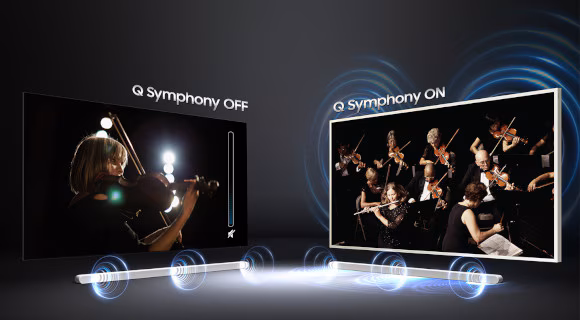 Ощутите революционное звучание с Q-Symphony, которая синхронизирует отслеживание движения звука между вашей звуковой панелью серии S и совместимым телевизором Samsung. Откройте для себя по-настоящему захватывающий объемный звук, который поможет вам оказаться в самом центре событий.