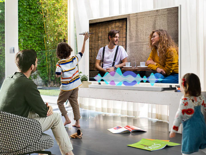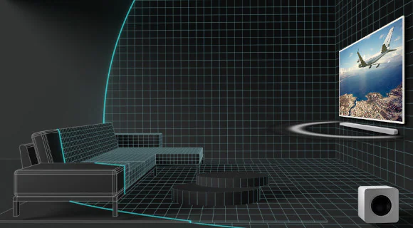 Погрузитесь в мир фильмов, музыки и спортивных трансляций благодаря звуку, адаптированному под ваше пространство и синхронизированному с динамиками вашего совместимого телевизора Samsung.