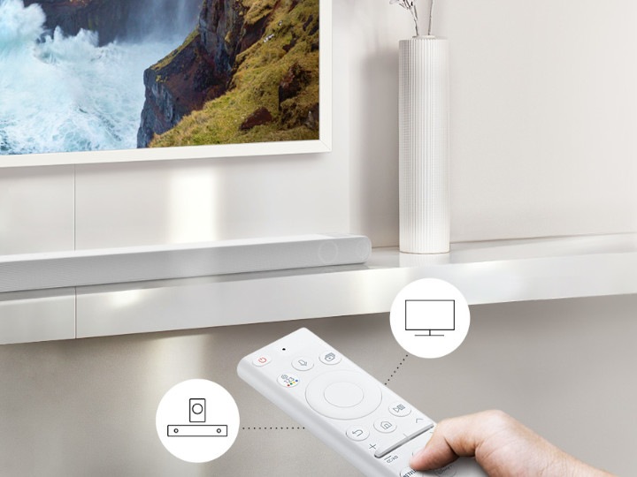 Упростите управление вашей саундбарной панелью и телевизором Samsung с помощью одного пульта дистанционного управления. Используйте пульт One Remote Control на телевизоре для управления основными функциями саундбарной панели, включая включение и выключение, регулировку громкости, а также настройки звука и эквалайзера через Smart Hub телевизора.