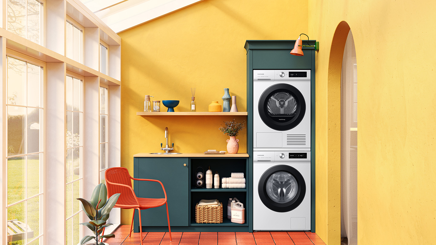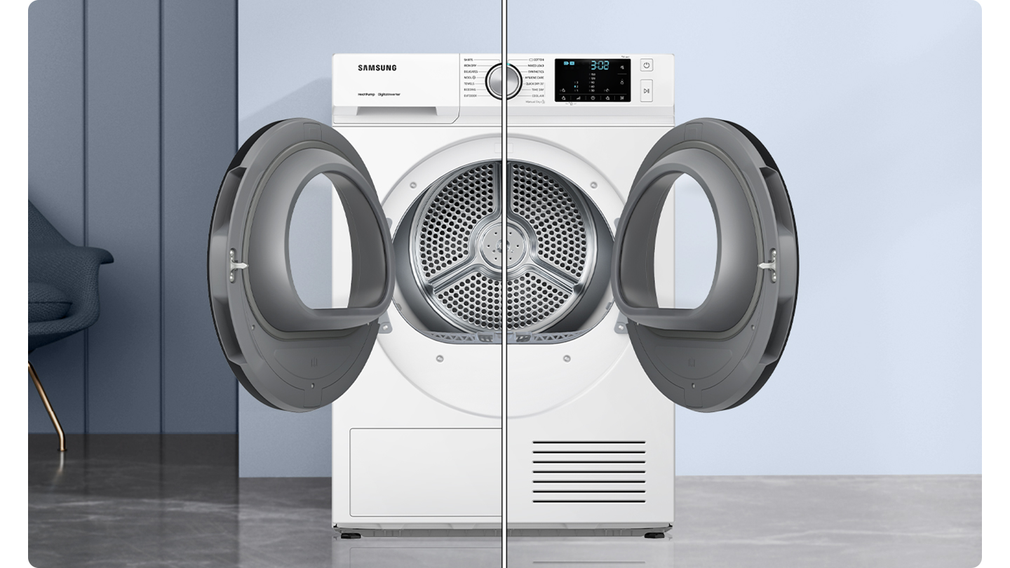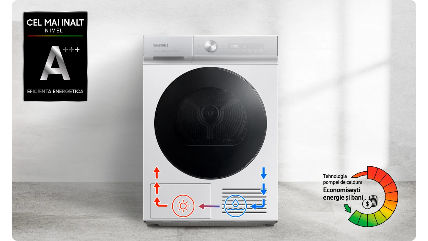 * Testat conform standardului IEC 61121:2013/sarcină 8 kg rufe de spălat /programul Cotton Cupboard cu pompă de căldură (DV80F5E4HGW) comparativ cu programul fără pompă de căldură (DV80H4100CW). Rezultatele individuale pot să difere.