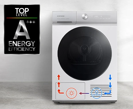 Economisește banii și protejează mediul folosind mai puțină energie electrică*. Tehnologia cu pompă de căldură oferă o modalitate eficientă din punct de vedere energetic, economic și blând de a vă usca hainele. Are clasa de eficiență energetică A+++ deoarece folosește „refrigerant” în loc de electricitate pentru a încălzi aerul și recirculează aerul cald pentru a evita risipa de energie.