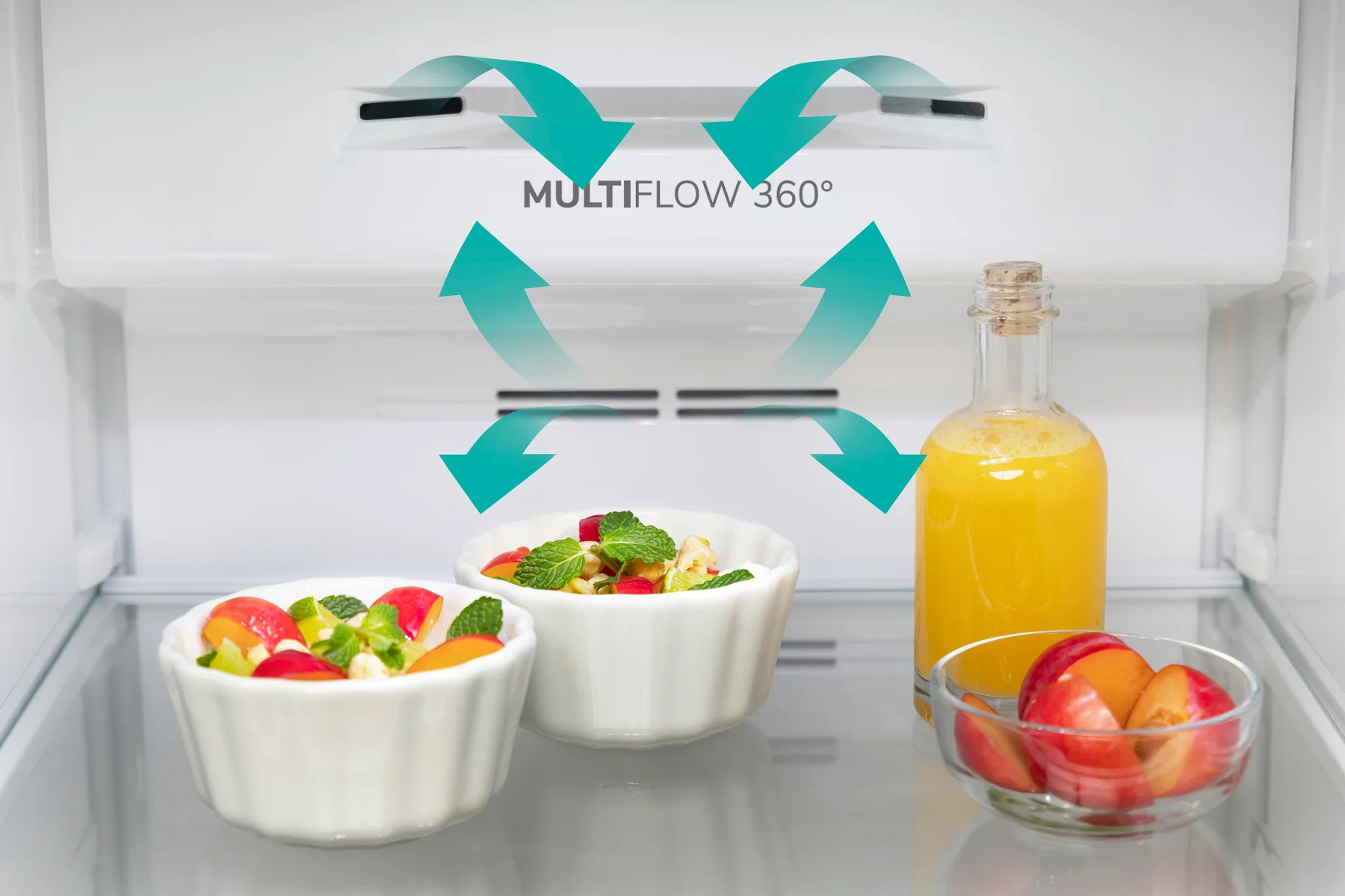 Sistemul de ventilație MultiFlow 360° distribuie uniform aerul în interiorul compartimentului frigiderului, asigurând o circulație optimă a aerului și cele mai bune condiții pentru depozitarea alimentelor.