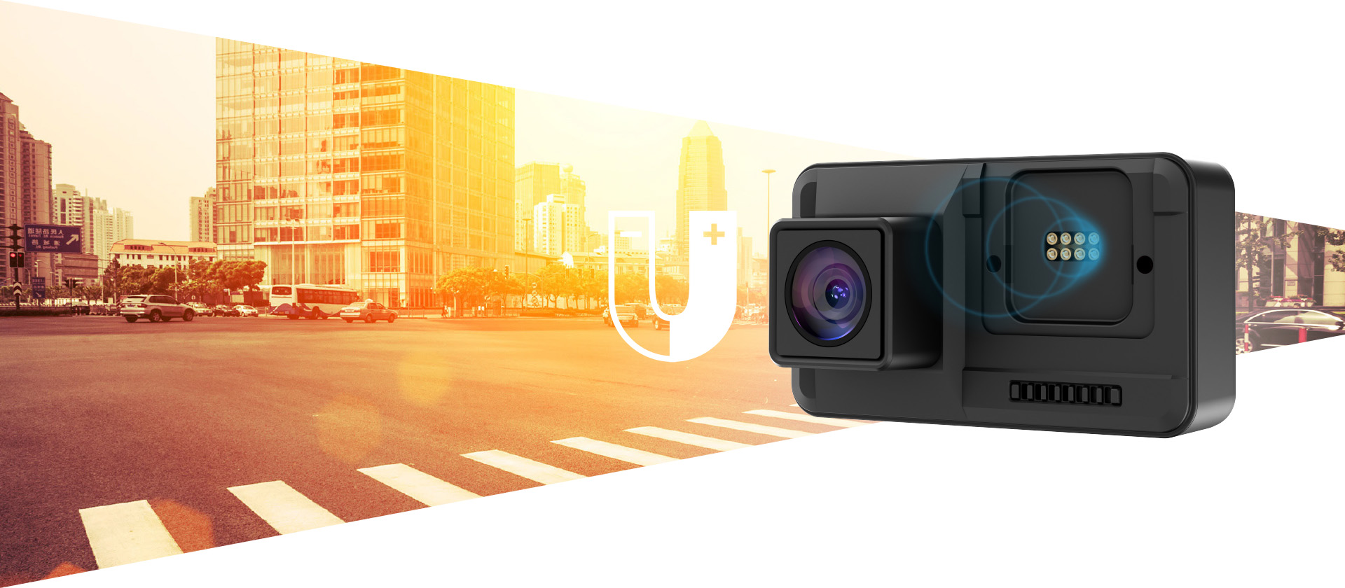 Магнитное крепление на клеевой основе надёжно фиксирует видеорегистратор на лобовом стекле. Подключение питания осуществляется через крепление, что позволяет быстро устанавливать и снимать устройство без отсоединения кабеля.