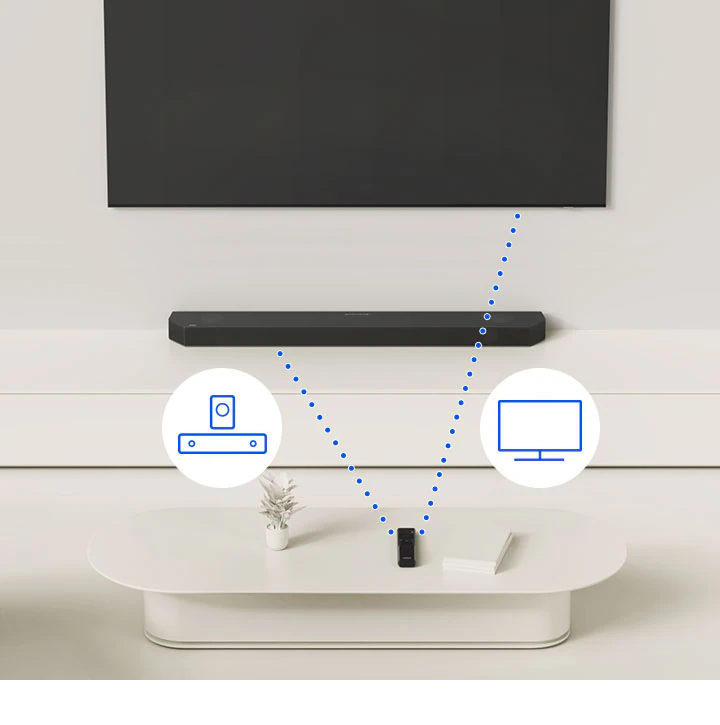 Пульт дистанционного управления телевизором Samsung предназначен не только для телевизора. Используйте его для управления основными функциями саундбара, такими как включение/выключение, громкость и звуковые эффекты.