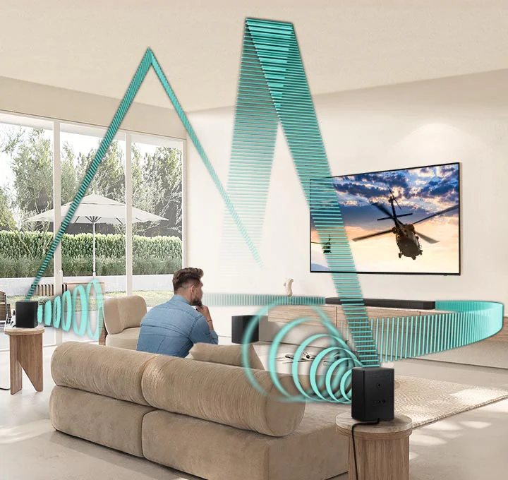 Саундбар Samsung калибрует звук на основе анализа помещения телевизором Samsung, поэтому вы слышите чистый и объемный звук, точно настроенный под ваше пространство.