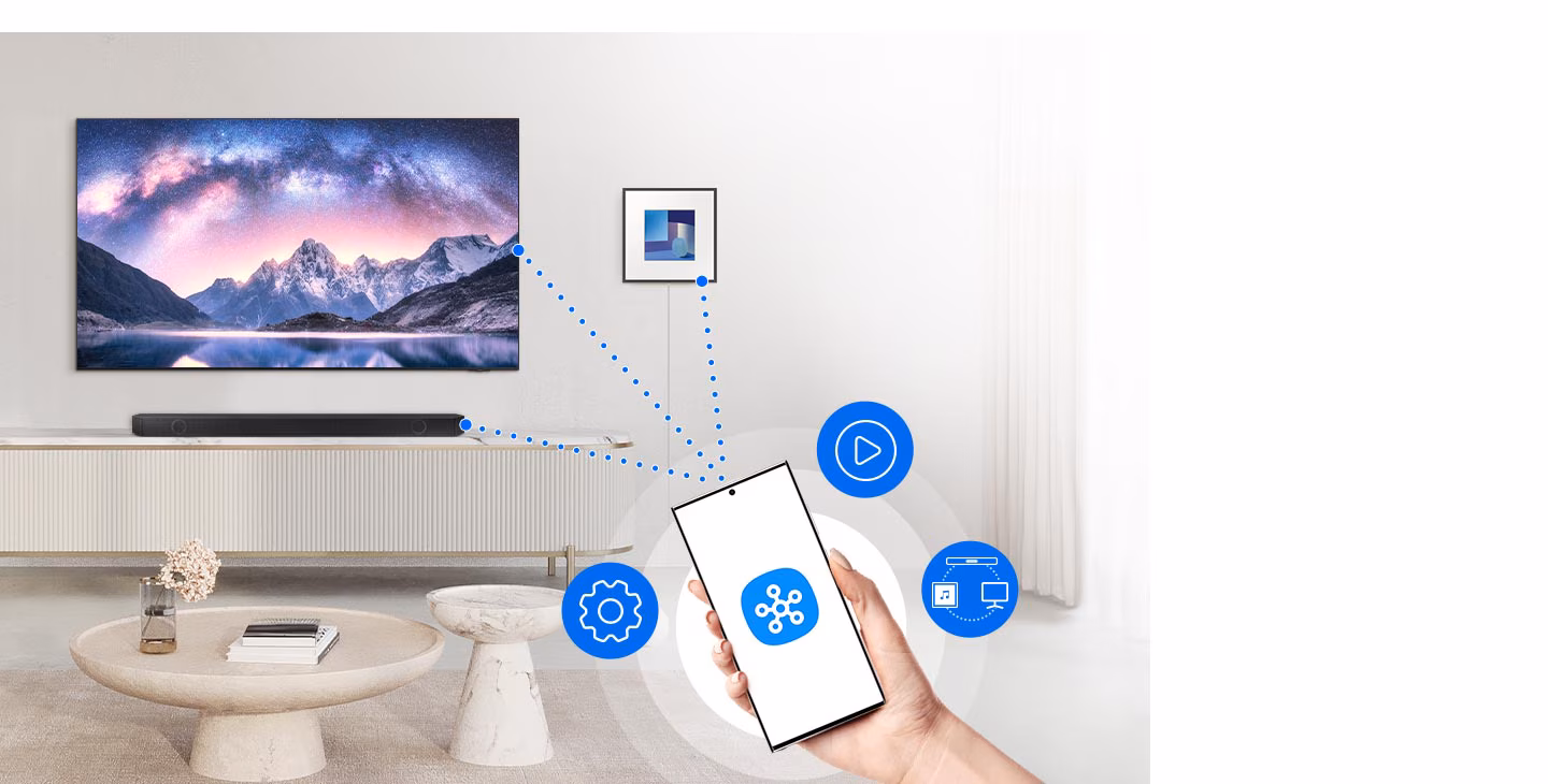 Воспроизведите аудио с вашего мобильного устройства на саундбаре. Благодаря одному простому прикосновению музыка на вашем устройстве плавно переключается на безупречное воспроизведение в саундбаре.