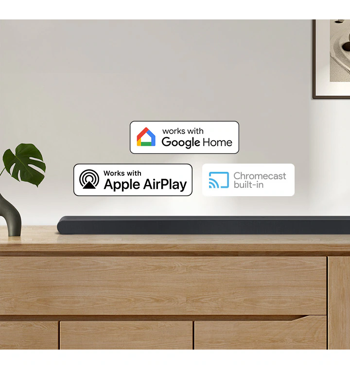 Управляйте саундбаром голосом с помощью устройства, поддерживающего Google Assistant со встроенным Chromecast. Вы можете использовать встроенный Chromecast для воспроизведения аудиоконтента из приложений и стриминговых сервисов, включая любимые песни. Или вы можете подключиться к AirPlay для потоковой передачи аудио – просто коснитесь иконки AirPlay на своем устройстве Apple. Благодаря Apple AirPlay вы можете наслаждаться любимой музыкой или подкастами из своего iPhone или iPad.