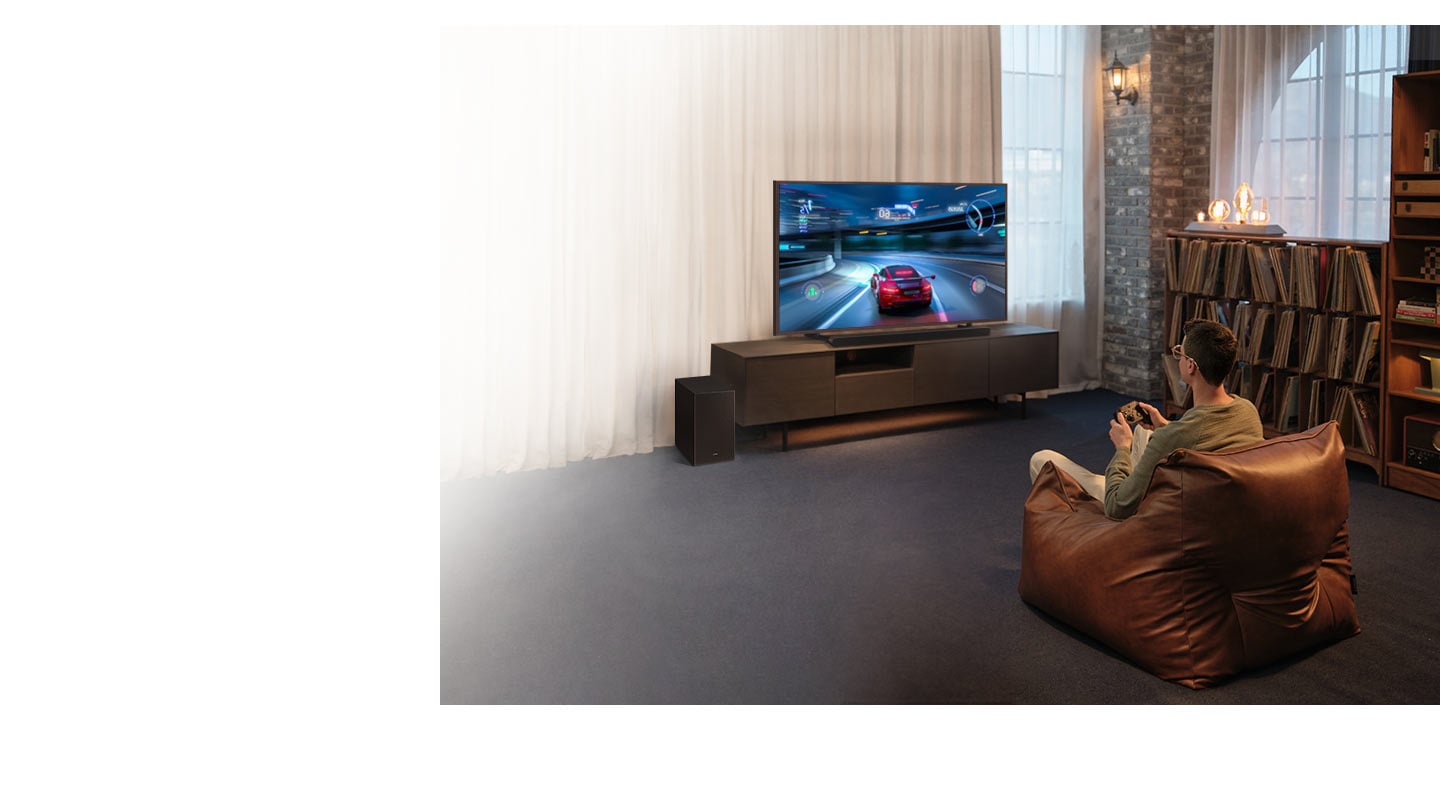 Погрузитесь в мир игры с мощным трехмерным звуком. Саундбар автоматически оптимизирует звук для игр, когда обнаруживает подключенную к телевизору Samsung консоль, а также оптимизирует его в соответствии с жанром в Игровом Хаби телевизора Samsung.