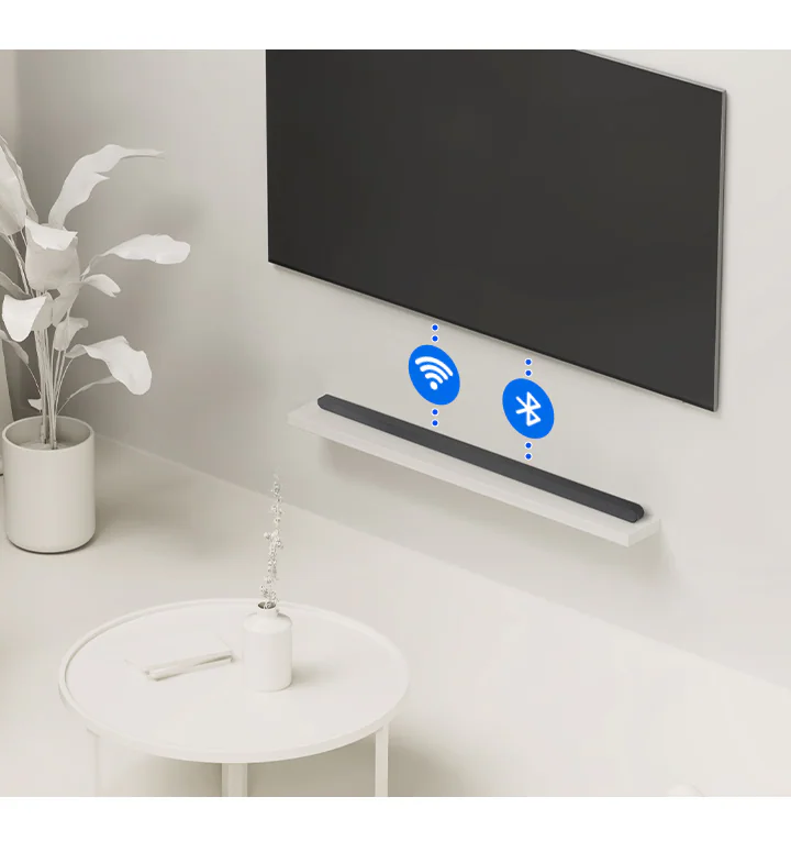 Подключите саундбар к телевизору Samsung с помощью Wi-Fi или Bluetooth, выполнив всего несколько шагов. Аудио и видео идеально синхронизируются для полного погружения в процесс просмотра.