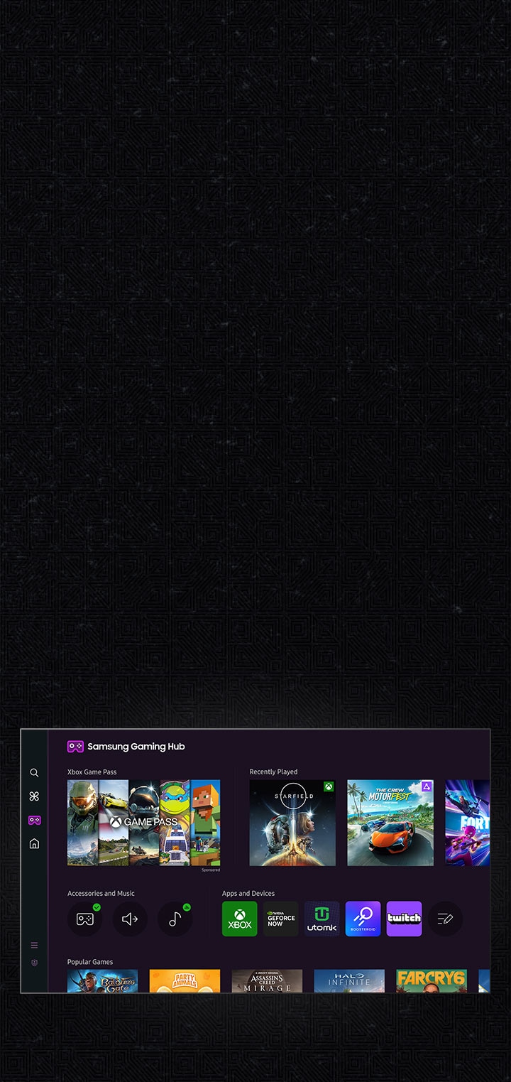 Платформа Gaming Hub предоставляет мгновенный доступ к вашим любимым потоковым платформам и игровым консолям без скачивания. Адаптивный игровой процесс обеспечивается современным процессором NQ8 AI 3-го поколения от Samsung, который применяет AI-масштабирование почти до 4K, усиливая эффект погружения даже в потоковых играх.