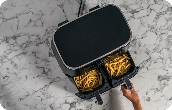 Gătește 2 preparate cu temperaturi, timpuri și setări diferite, în 2 sertare de gătit - și le ai pe ambele gata de servit exact în același timp, utilizând funcția SYNC! Mai multe persoane la masă? Folosește funcția MATCH în ambele zone pentru a face dublul cantității de mâncare în același timp!