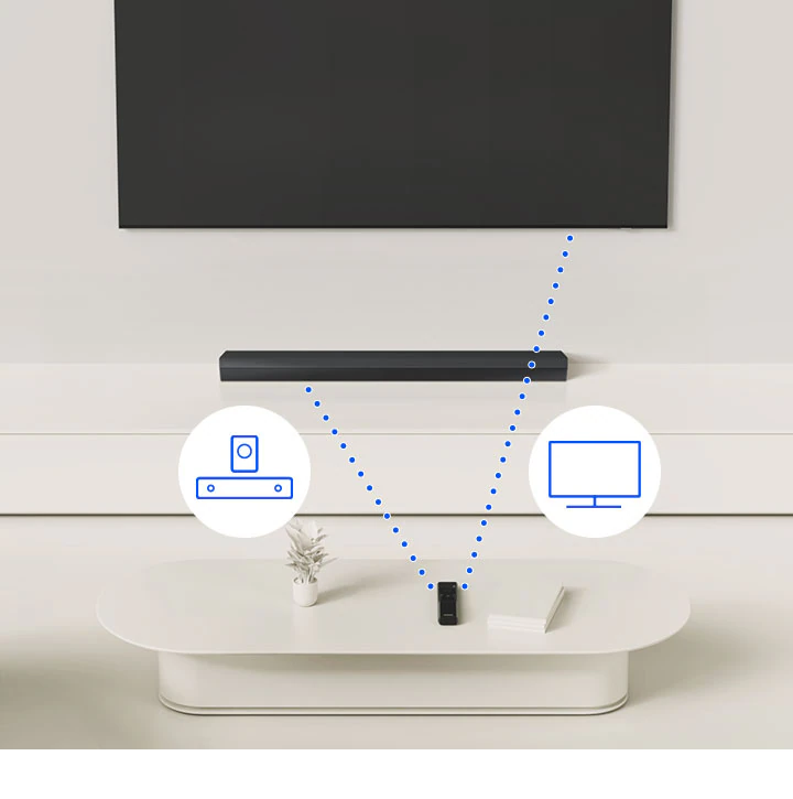 Пульт дистанционного управления телевизором Samsung предназначен не только для телевизора. Используйте его для управления основными функциями саундбара, такими как включение/выключение, громкость и звуковые эффекты.
