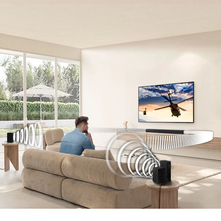 Комплект беспроводных тыловых динамиков позволяет расширить возможности вашего саундбара к системе объемного звучания, чтобы получить еще больше впечатлений от просмотра фильмов.