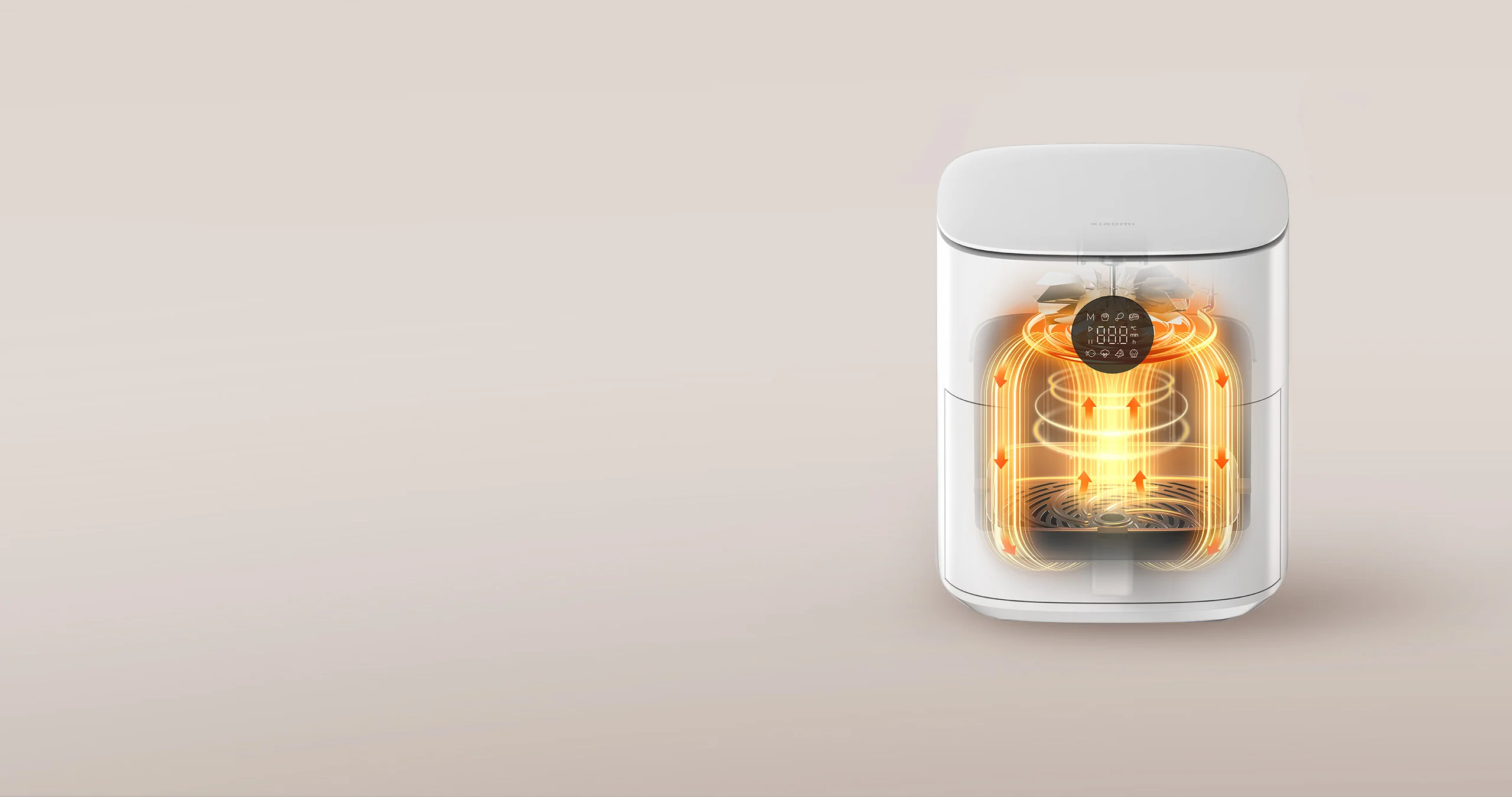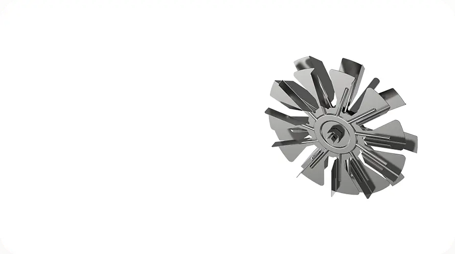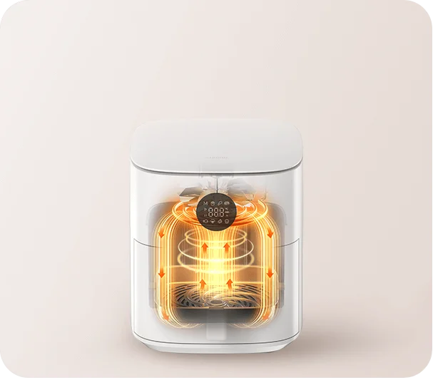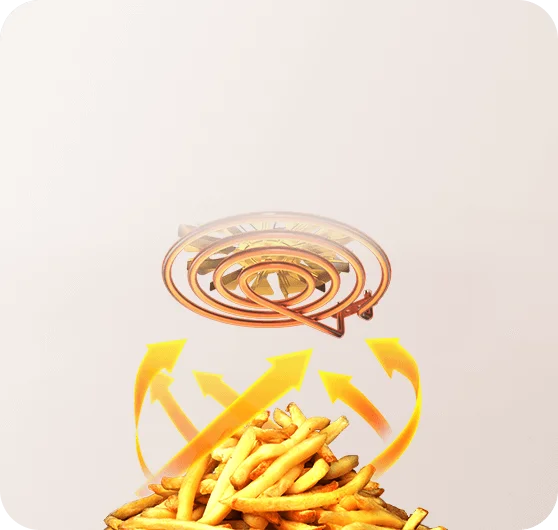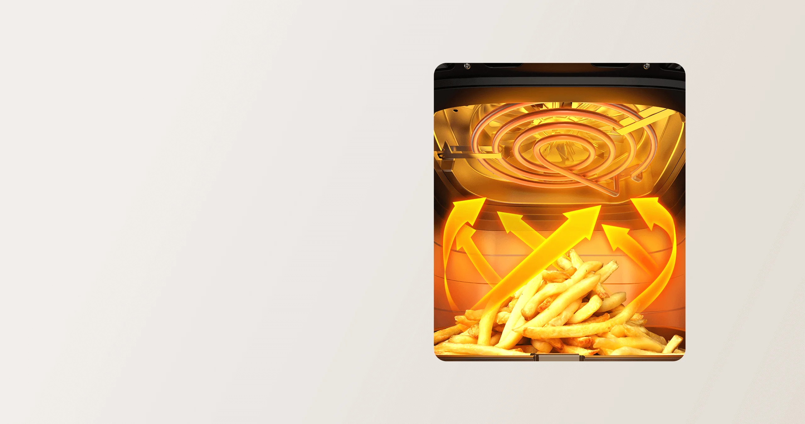 Двухлопастной спиральный вентилятор и 3D-циклонная жарочная поверхность обеспечивают конвекционный нагрев на 360° для равномерного приготовления пищи без необходимости переворачивания.