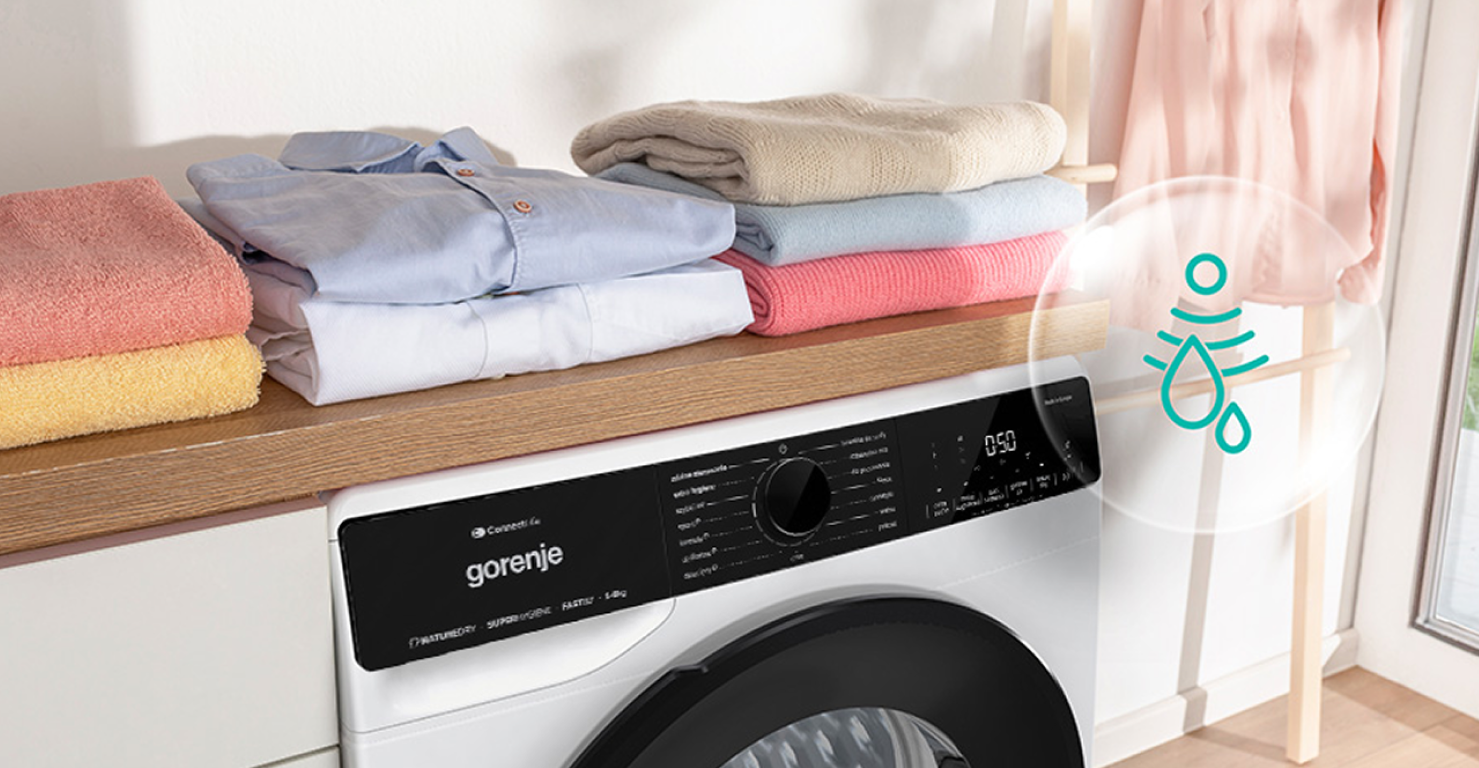 *Testele au fost efectuate pe articole de îmbrăcăminte cu eticheta „a nu se usca în uscător". Contracția țesăturii a fost redusă până la 56 %, în funcție de tipul materialului. Grupul de control al rufelor a fost uscat într-un uscător standard cu pompă de căldură fără funcția NatureDry. Testele au fost efectuate în centrul de cercetare și dezvoltare Gorenje din Slovenia. Valoarea de 32 °C este rezultatul mediu al măsurătorii temperaturii pe articolele de îmbrăcăminte testate.