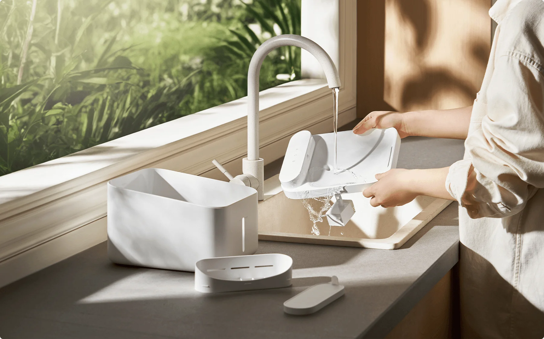 Fântâna poate fi plasată fără să vă faceți griji pentru firele deteriorate. Chiar și în timpul unei întreruperi de curent, apa va continua să curgă.
