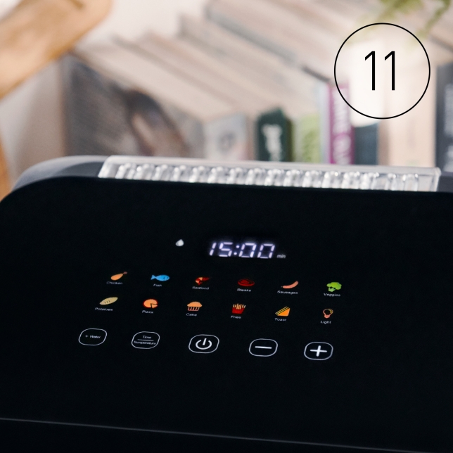 Spuneți adio ghiciturilor. Pur și simplu alegeți unul dintre cele 11 meniuri presetate printr-o simplă apăsare pe icoanele luminoase și ușor de înțeles de pe panoul LED: „Cartofi prăjiți”, „Pui”, „Pește”, „Fructe de mare”, „Fripturi”, „Crenvurști”, „Legume”, „Cartofi”, „Pizza”, „Prăjitură” și „Paine prăjită”. Dacă doriți, puteți personaliza modul de funcționare setând propria temperatură și timp – de la 1 la 60 de minute și de la 80 la 200 °C.