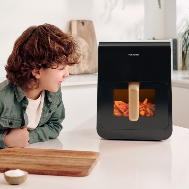 *Se referă la economisirea timpului și energiei atunci când gătiți cu friteuze cu aer cald Panasonic. Rezultatele se bazează pe timpul mediu și puterea consumată pe oră pentru prepararea a 3 feluri diferite în timpul testelor interne Panasonic, folosind 3 cuptoare electrice incorporate cu volume cuprinse între 71 și 65 de litri. Toate cuptoarele aveau o clasă de eficiență energetică A sau superioară și au fost oferite de 3 mărci cunoscute în diferite game de preț (Marea Britanie, noiembrie 2022 / iulie 2024). Rezultatul gătirii depinde și de preferințele personale, de alegerea ingredientelor și de cantitatea de preparate gătite.