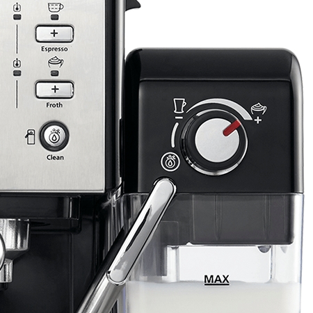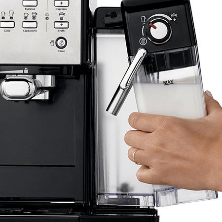 Prima Latte II имеет резервуар для молока объемом 600 мл. Он является съемным, и когда не используется, его можно легко хранить в холодильнике для сохранения свежести. Таким образом, у вас всегда под рукой свежее молоко для вкусного капучино или латте.