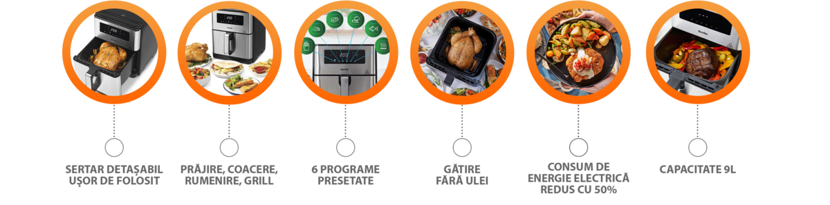 Doar pune ingredientele preferate în vas, selectează programul (cartofi prăjiți, pui, legume, friptură, pește sau coacere), iar airfryerul se ocupă de tot!