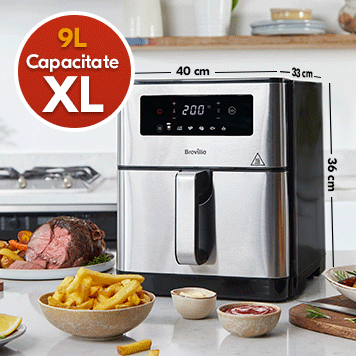 Cu o capacitate de 9 litri, airfryerul este ideal pentru pregătirea meselor în familie. Mai mult, produsul are dimensiuni reduse, ca să ocupe cât mai puțin loc pe blatul din bucătărie.