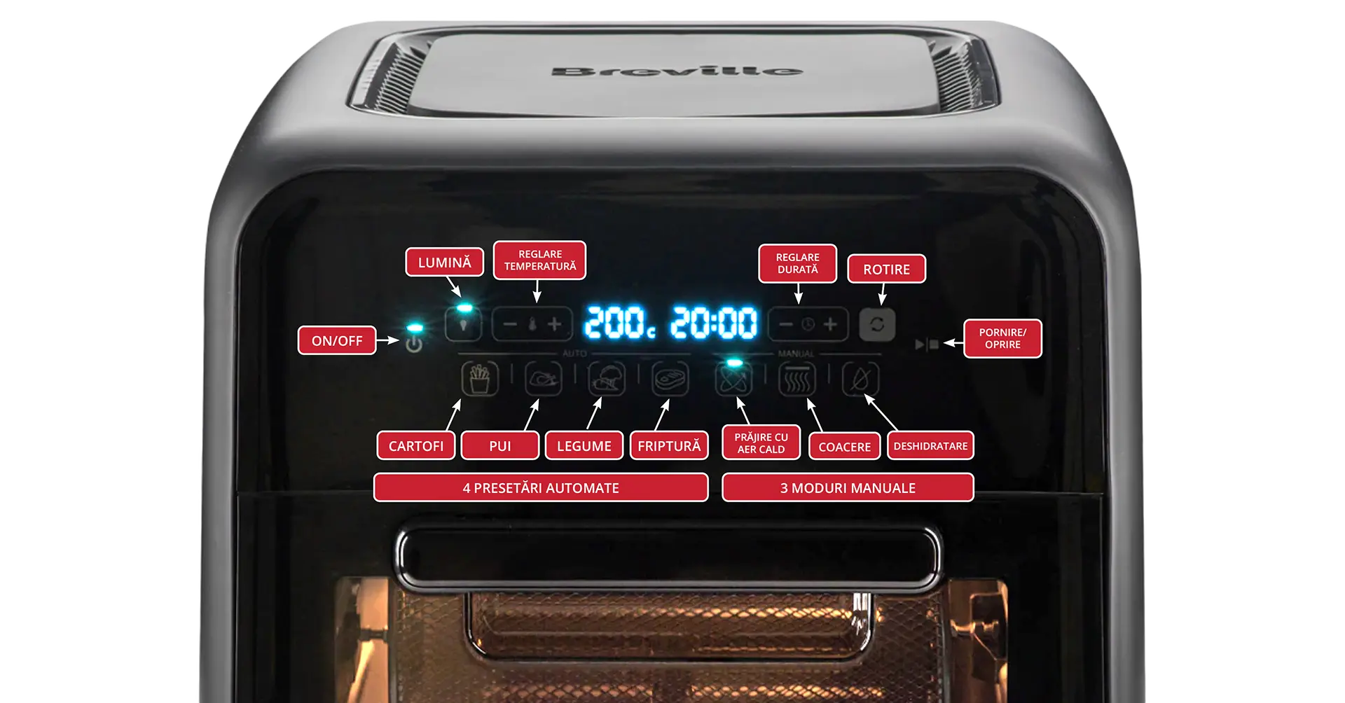 - 3 Moduri manuale de gătire: prăjire cu aer cald, coacere și deshidratare