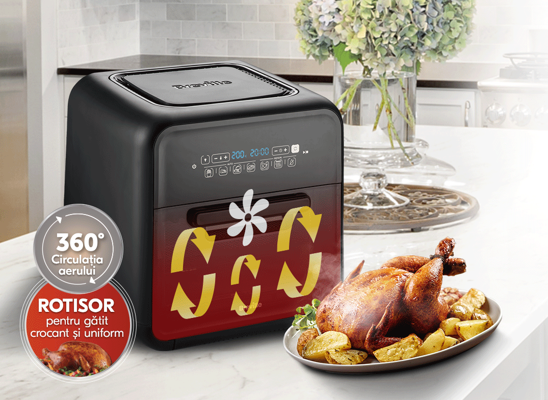 Cu airfryer-ul Breville de 10L cu coș rotativ și rotisor, prăjești
