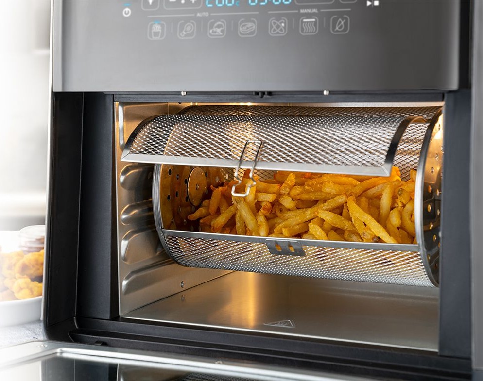 Tehnologie sănătoasă, cu aer cald. Gustul delicios al cartofilor prăjiți în coșul rotativ. Interior din oțel galvanizat.