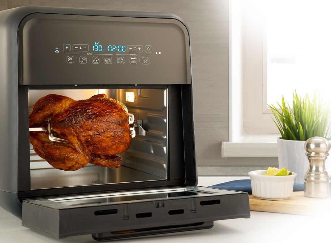 Gătești perfect puiul întreg cu circulația 360° a aerului cald și rotisorul inclus