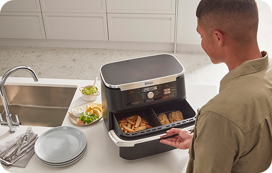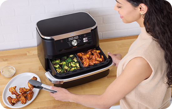 Airfryerul Ninja FlexDrawer AF500EU este ideal pentru orice situatie, în funcție de nevoile tale. Poți găti două feluri de mâncare diferite în același timp folosind tehnologia DualZone sau poți îndepărta separatorul pentru a crea MegaZone, ideal pentru cantitați mari, gătind simultan câte 8 porții de mâncare. Airfryerele Ninja sunt confecționate din materiale sigure, având atât cuva cât și accesoriile din ceramică.