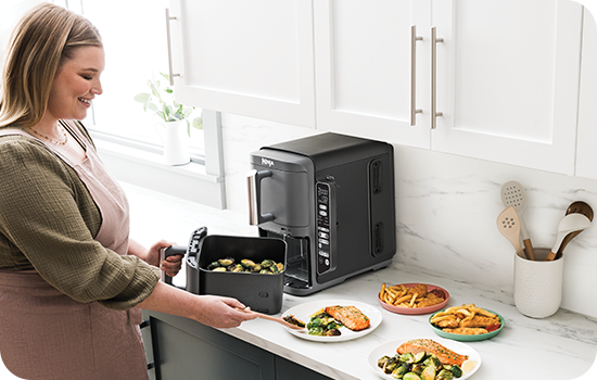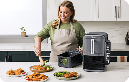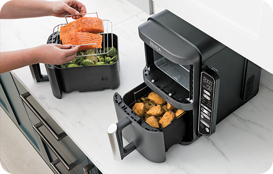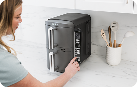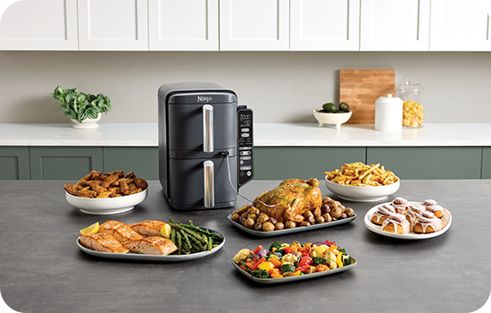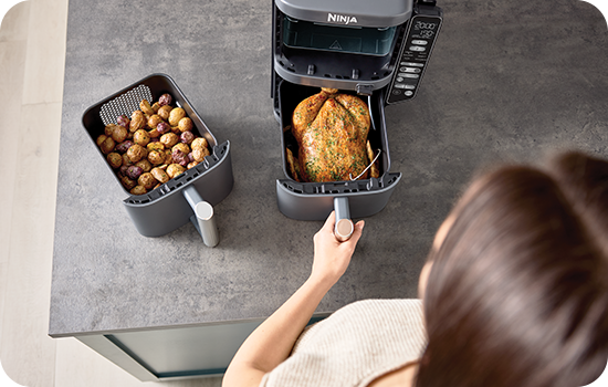 Cu Airfryerul Ninja Double Stack XL Smart poți găti 2 preparate diferite, la temperaturile și timpurile de gătire specifice, care să fie gata în același timp. Alege funcția SYNC atunci când gătești alimente diferite care vrei să fie gata simultan sau MATCH pentru a găti același preparat în ambele sertare - dublând astfel cantitatea de mâncare gătită.