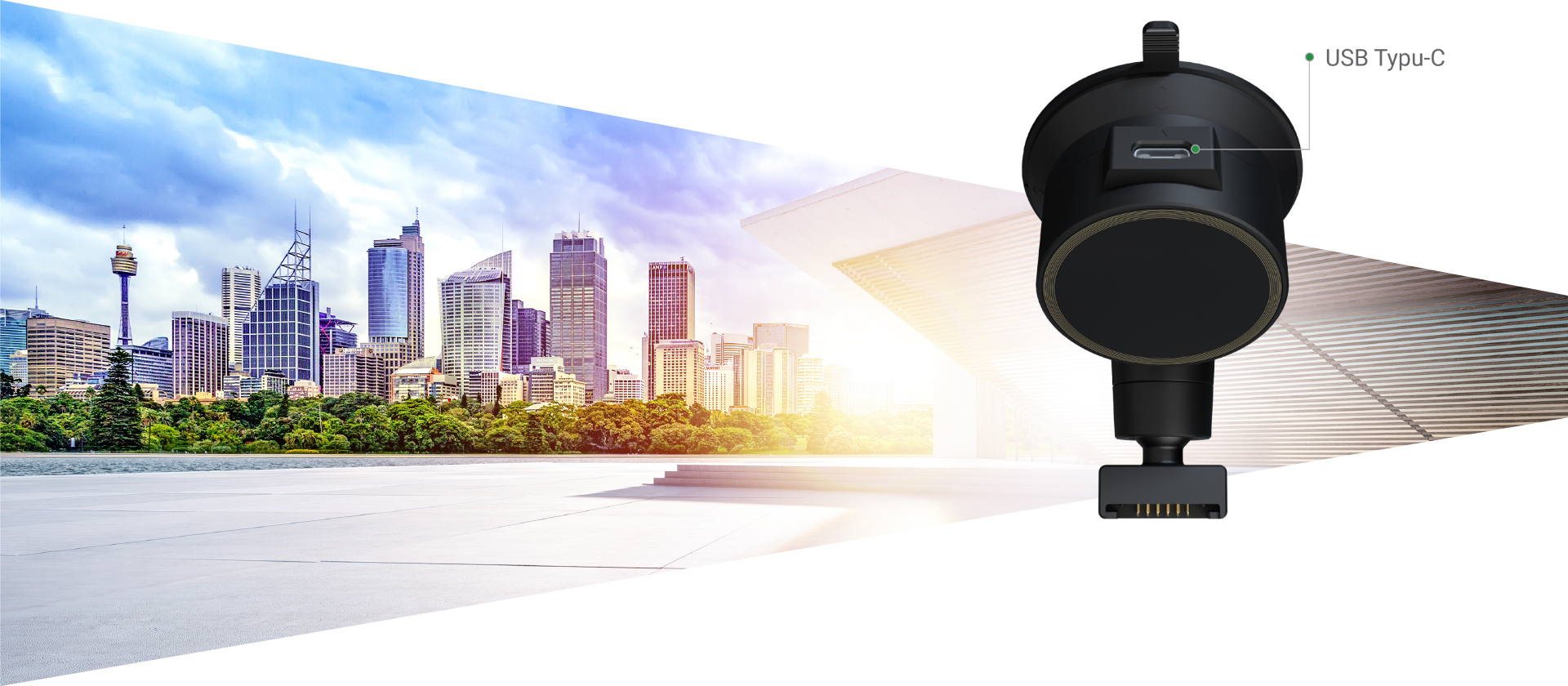 Крепление на присоске с поворотным фиксатором обеспечивает прочную установку видеорегистратора. Для удобства подключения и прокладки кабеля питание подаётся через кронштейн — посредством разъёма USB-C на держателе. Второй разъём USB-C на корпусе устройства предназначен для подключения к компьютеру.