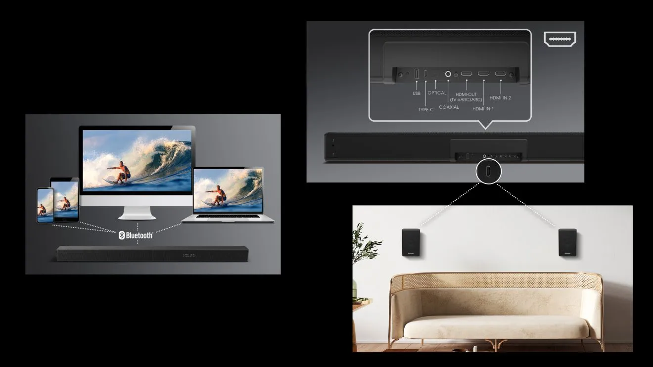 Fie că este vorba de telefon, televizor, pick-up, consolă de jocuri etc., toate dispun de metode de conectare la echipamente audio cu conexiuni multiple, precum USB, Type-C, optic, coaxial, HDMI-OUT și HDMI-IN, și sunt compatibile cu difuzoare surround spate wireless.