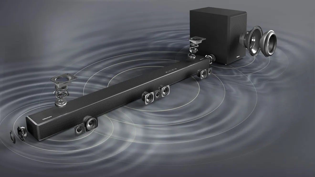 Soundbar-ul Hisense U5120G este dotat cu 11 difuzoare și un subwoofer wireless de 180 wați, oferind o putere audio totală de 510 wați.