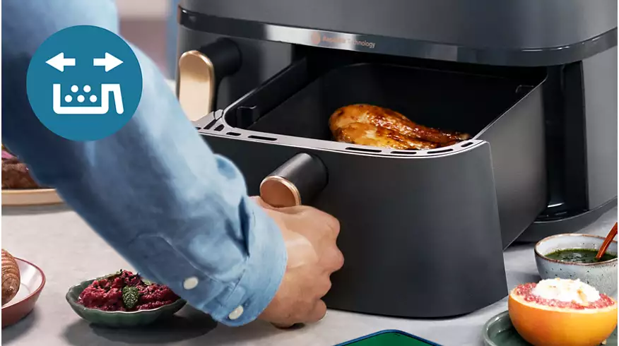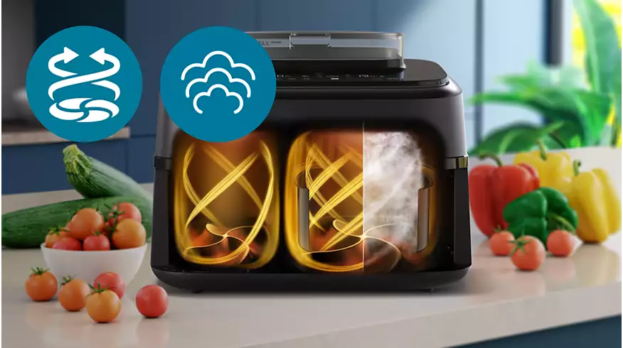 Готовьте на 40% быстрее и экономите до 80% энергии по сравнению с духовкой благодаря Philips Airfryer с двумя корзинами.