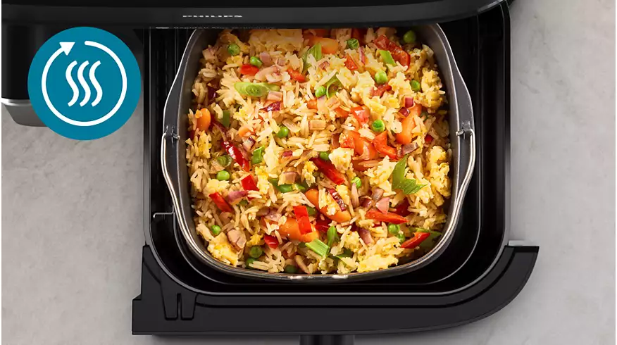 Вчерашний ужин на обед? Конечно! Функция разогрева использует пар для сохранения влаги, идеально подходит для блюд вроде риса или лазаньи, которые пересыхают в обычных фритюрницах или микроволновках.