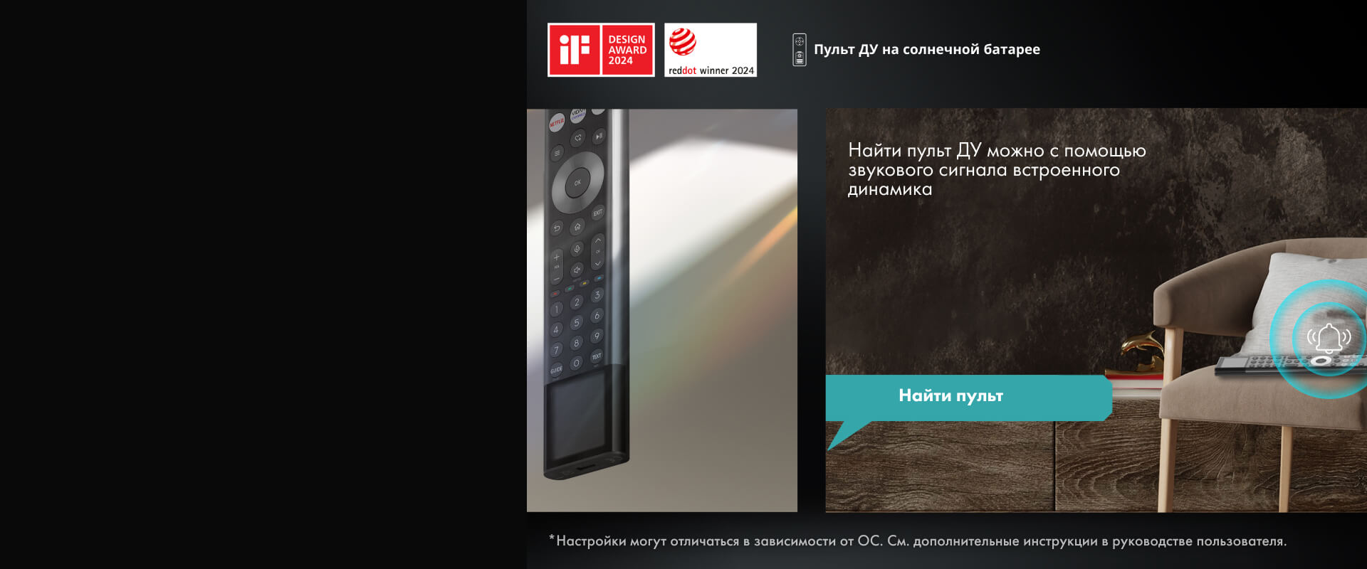 Встроенная солнечная панель и USB-C порт заряжают пульт от окружающего света — никаких батареек и лишних отходов. А если пульт потерялся, просто нажмите кнопку включения ТВ или скажите: «Найди пульт» — он подаст звуковой сигнал.