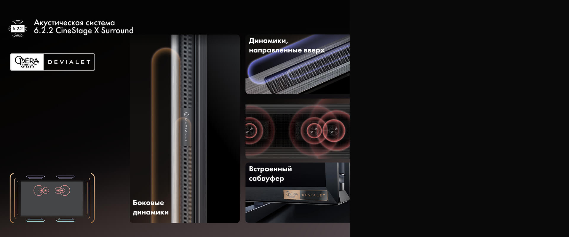 Почувствуйте подлинную мощь звука с многоканальной аудиосистемой Hisense 6.2.2, спроектированной при поддержке экспертов Devialet (известных своей премиальной акустикой, включая серию Opéra de Paris). Вас захлестнут такие эмоции, словно вы сами вышли на сцену, а не просто слушаете звук из колонок.