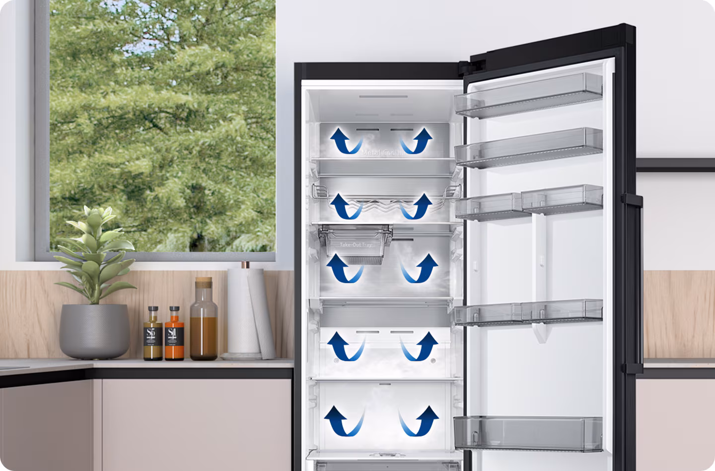 Asigură-te că toate alimentele sunt refrigerate corespunzător. Sistemul de răcire integrală asigură o răcire uniformă în tot frigiderul. Acesta monitorizează constant temperatura și circulă aerul rece prin orificii de ventilație amplasate strategic. Acest lucru menține fiecare produs la temperatura ideală și îl face să rămână proaspăt pentru mai mult timp.