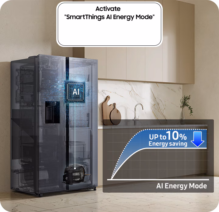 Контролируйте и экономьте энергию с умом. Режим AI Energy анализирует ваши привычки использования холодильника и оценивает энергопотребление с помощью искусственного интеллекта. Если предполагаемый счёт за электроэнергию превышает заданный лимит, система предложит активировать энергосберегающий режим, чтобы снизить потребление энергии до 10%.