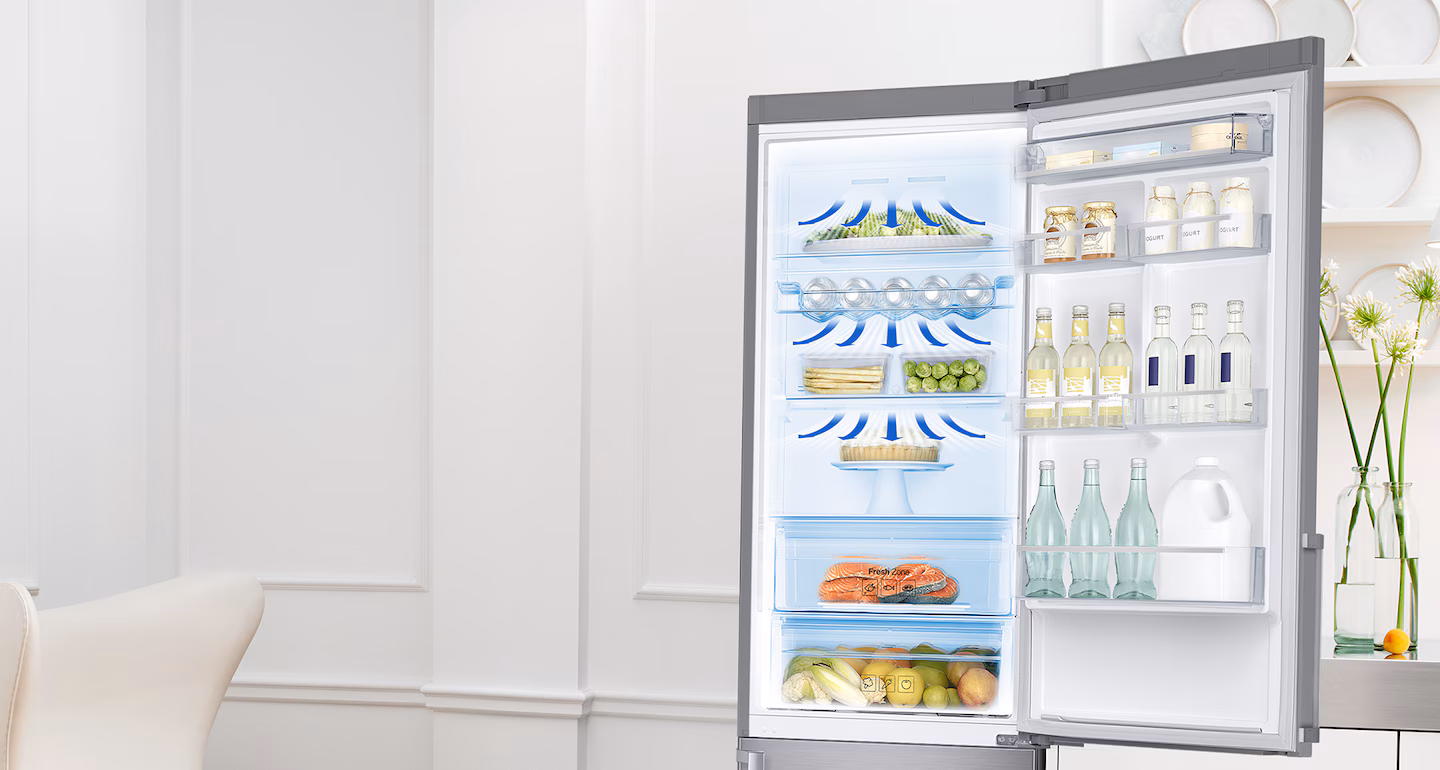 Sistemul All Around Cooling are grijă să răcească în mod egal și la aceeași temperatură tot frigiderul, dintr-un colț în celălalt. Temperatura constantă este asigurată de aerul rece suflat în dreptul fiecărui raft. Astfel, fiecare articol este răcit eficient iar mâncarea rămâne proaspătă mai mult timp.