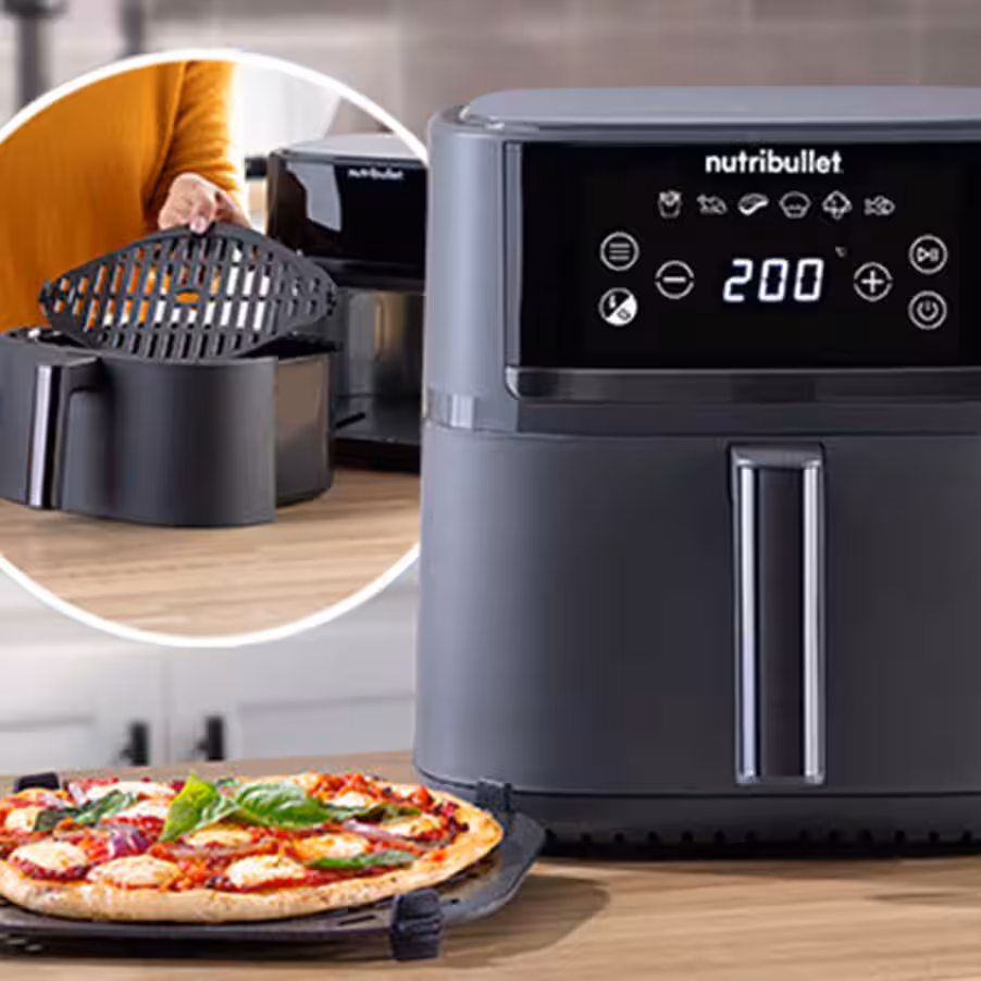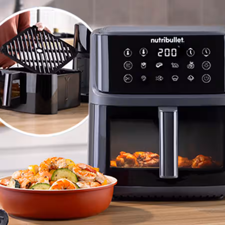 Готовьте горячие блюда, закуски и гарниры с содержанием жира до 90% меньше одним нажатием кнопки. Благодаря 6 предустановленным программам, фритюрница с горячим воздухом nutribullet CrispLite гарантирует идеальный результат каждый раз – будь то картофель фри, хрустящая курица, сочный стейк, овощи, морепродукты или выпечка. Она имеет вместительность 6 литров – идеально для больших порций или индивидуальных блюд. Благодаря технологии циркуляции воздуха Vortex 360° тепло распределяется постоянно и равномерно, что обеспечивает быстрое приготовление с меньшим количеством масла и меньшими хлопотами по уборке. Корзина и гриль имеют антипригарное керамическое покрытие без PFAS для легкого и безопасного приготовления. Благодаря компактному и элегантному дизайну, эту фритюрницу с горячим воздухом очень легко хранить. Наслаждайтесь вкусной и здоровой пищей!