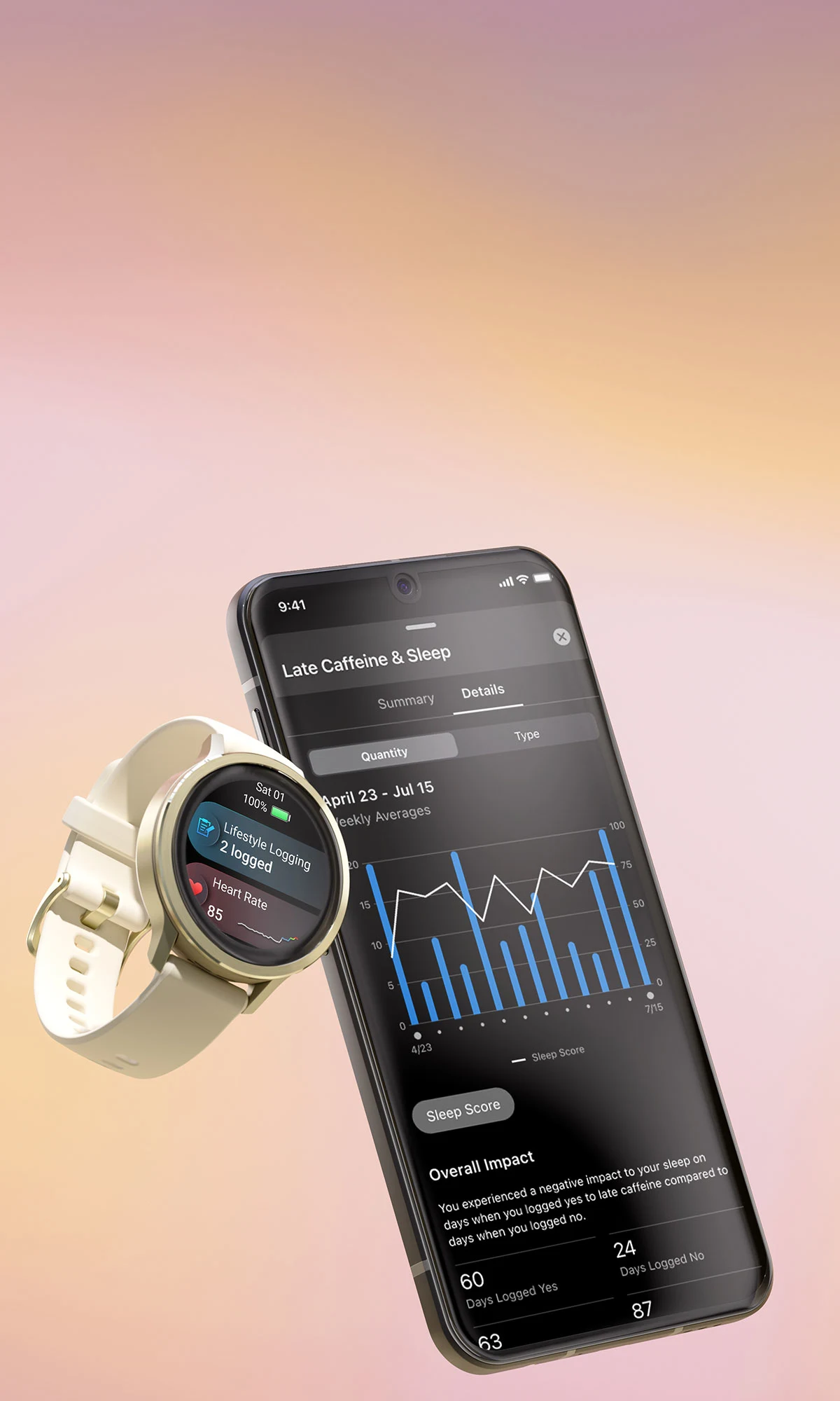 Записывайте персонализированные или предустановленные поведенческие привычки — такие как потребление кофеина и алкоголя — и просматривайте отчёты о том, как эти выборы влияют на ваш сон, стресс и ВСР в приложении Garmin Connect. Таким образом, вы можете принимать более здоровые решения.