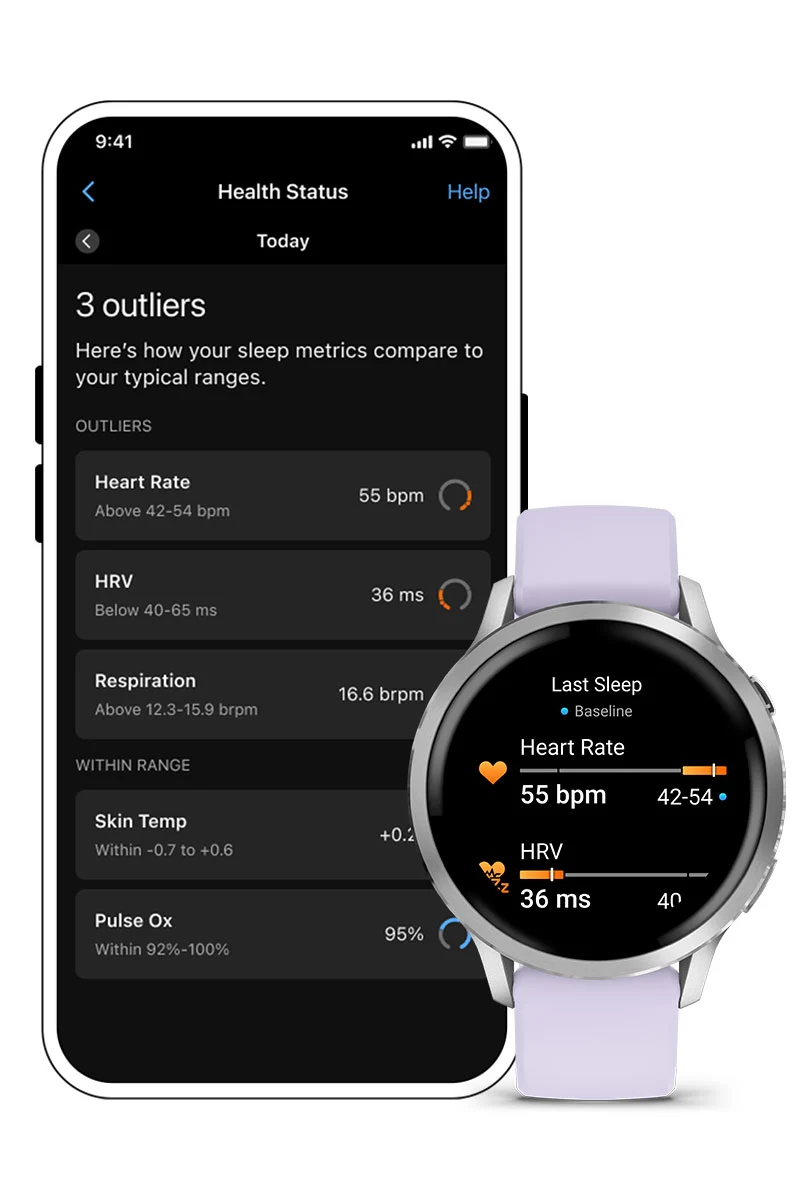Узнавайте, отклоняются ли ваши показатели здоровья — такие как частота пульса, ВСР, температура кожи и Pulse Ox во время сна — от вашего обычного диапазона, что может указывать на дополнительную нагрузку на ваш организм. Эти изменения могут быть связаны с уровнем физической активности, окружающей средой, стрессом, употреблением алкоголя, потенциальными заболеваниями и многим другим. В настоящее время эта функция доступна в бета-версии.