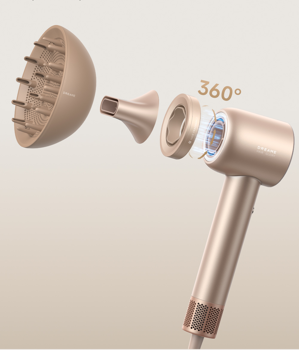 Фен Hair Glory Mix упрощает сушку волос благодаря наличию различных магнитных насадок: концентратор для разглаживания выпрямляет волосы, насадка-диффузор формирует локоны, а уникальная насадка-ароматизатор придает волосам приятный аромат.