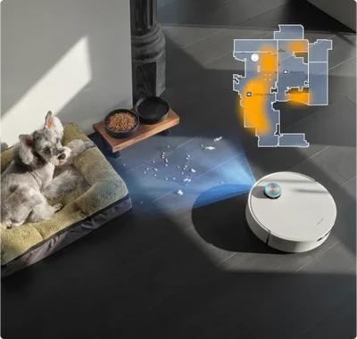 Домашние животные бродят, игрушки разбросаны, мебель двигается — пылесос видит все. 2 камеры ИИ картографируют 3D-детали и избегают более 240 объектов, от зарядных кабелей до игрушек для домашних животных, с точностью до 0,04 дюйма.