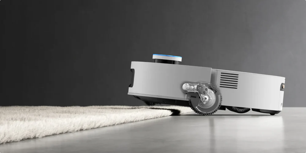 Робот-пылесос поднимает шасси, боковую щетку и роликовую швабру при переходе через ковры и эффективно перемещается между комнатами в режиме перехода через ковры.