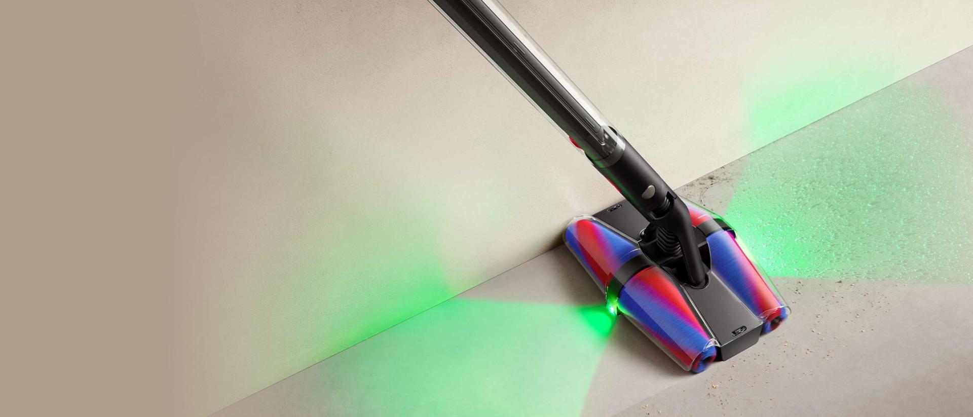 Conurile din față ale periilor se rotesc într-o direcție, iar cele din spate în direcția opusă, asigurând o curățare superioară în toate direcțiile pentru o ușurință și eficiență sporită. Iluminarea cu laser în față și în spate permite vizualizarea prafului invizibil de pe pardoselile dure în ambele mișcări, precum și o verificare clară a îndepărtării complete a prafului.