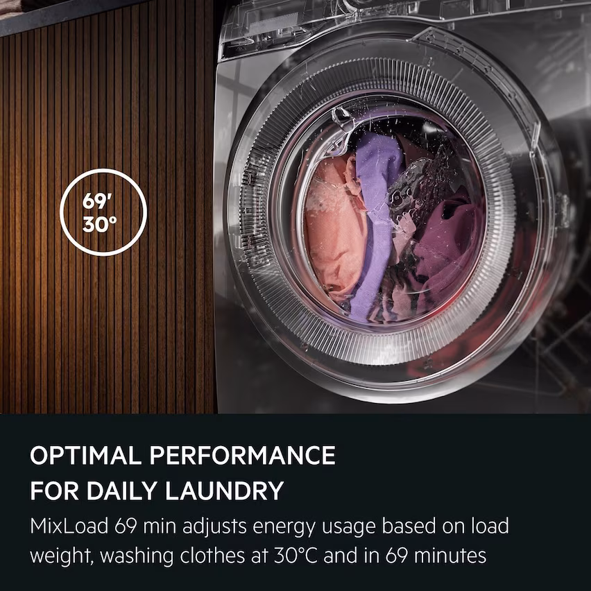 Programul MixLoad 69 min ajustează consumul de energie în funcţie de greutatea încărcăturii la spălarea zilnică a unor încărcături mixte. Spală hainele la 30°C în doar 69 de minute. Performanţe optime și rezultate de curăţare remarcabile cu MixLoad 69 min.